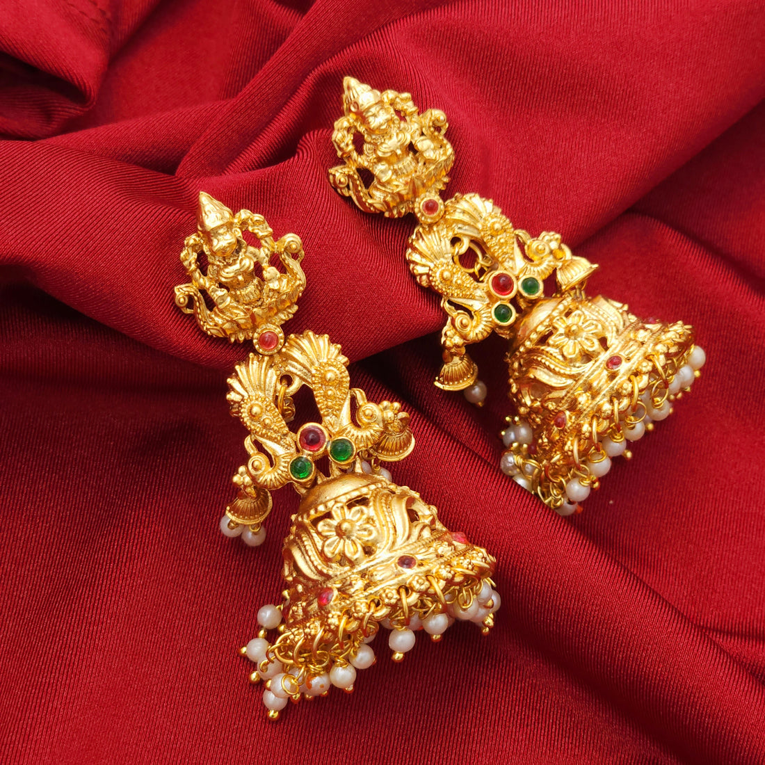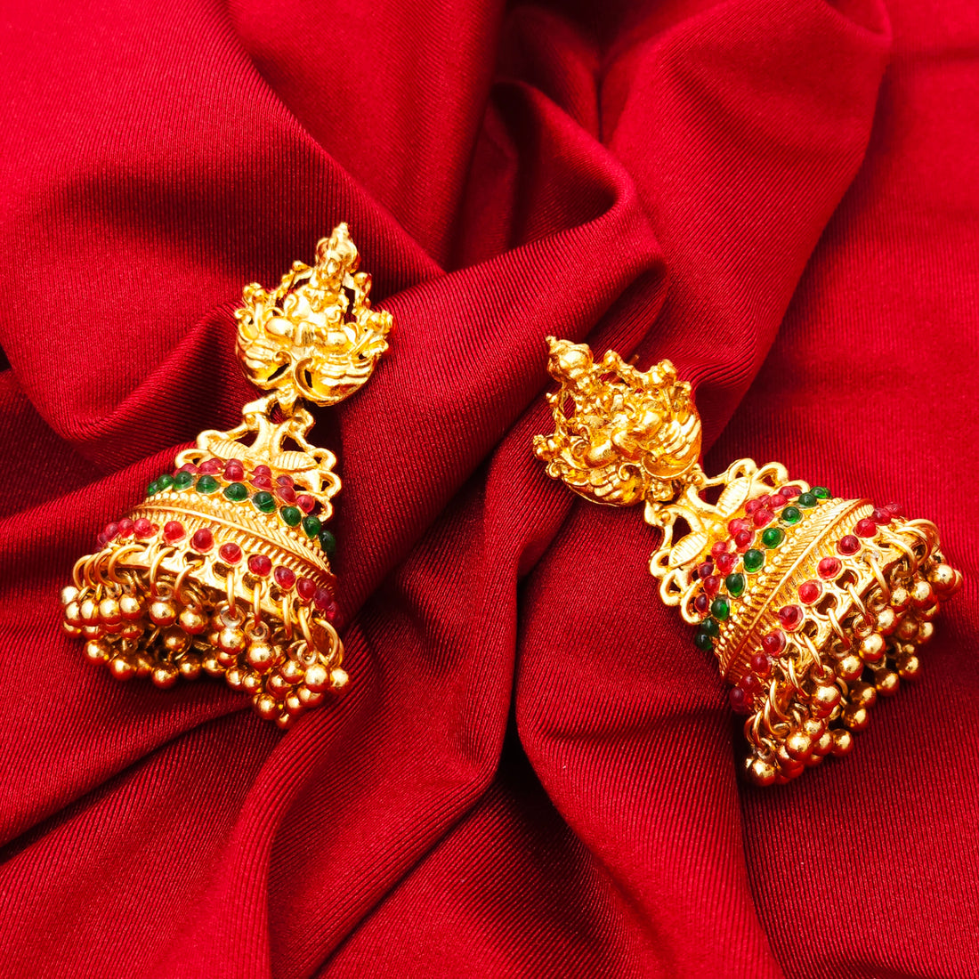 A divine ode to tradition, these gold-plated brass jhumkas feature intricate Lakshmi motifs atop layers...
