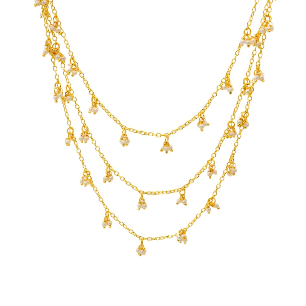 A classic three-layer haar handcrafted in brass with dainty freshwater pearls. Perfect for weddings, pujas,...