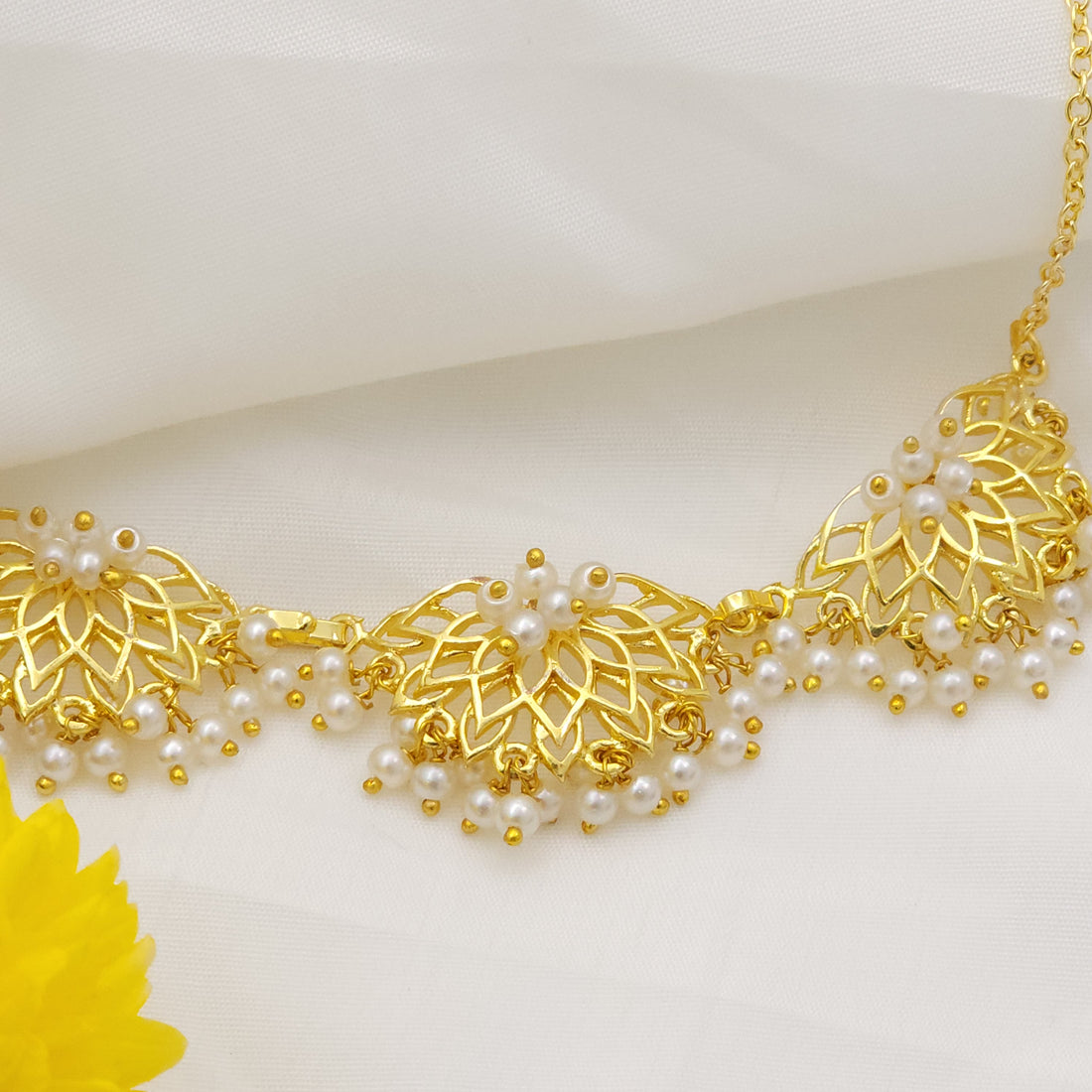 Inspired by Indian lotus jaali art, this brass choker with freshwater pearl tassels brings heritage...