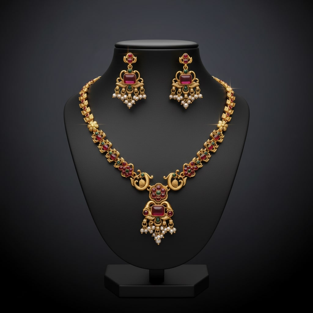 A heritage-inspired gold-plated alloy necklace set with floral motifs, peacock details, and ruby-green kundan stones....