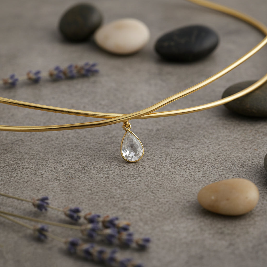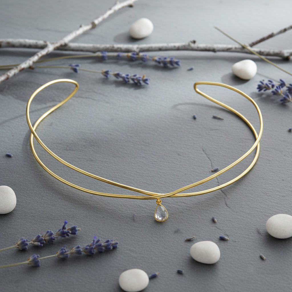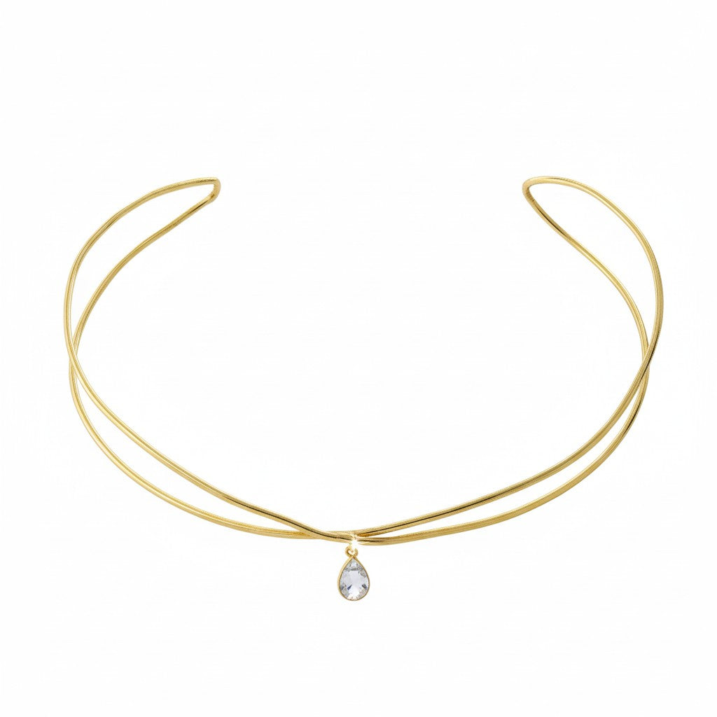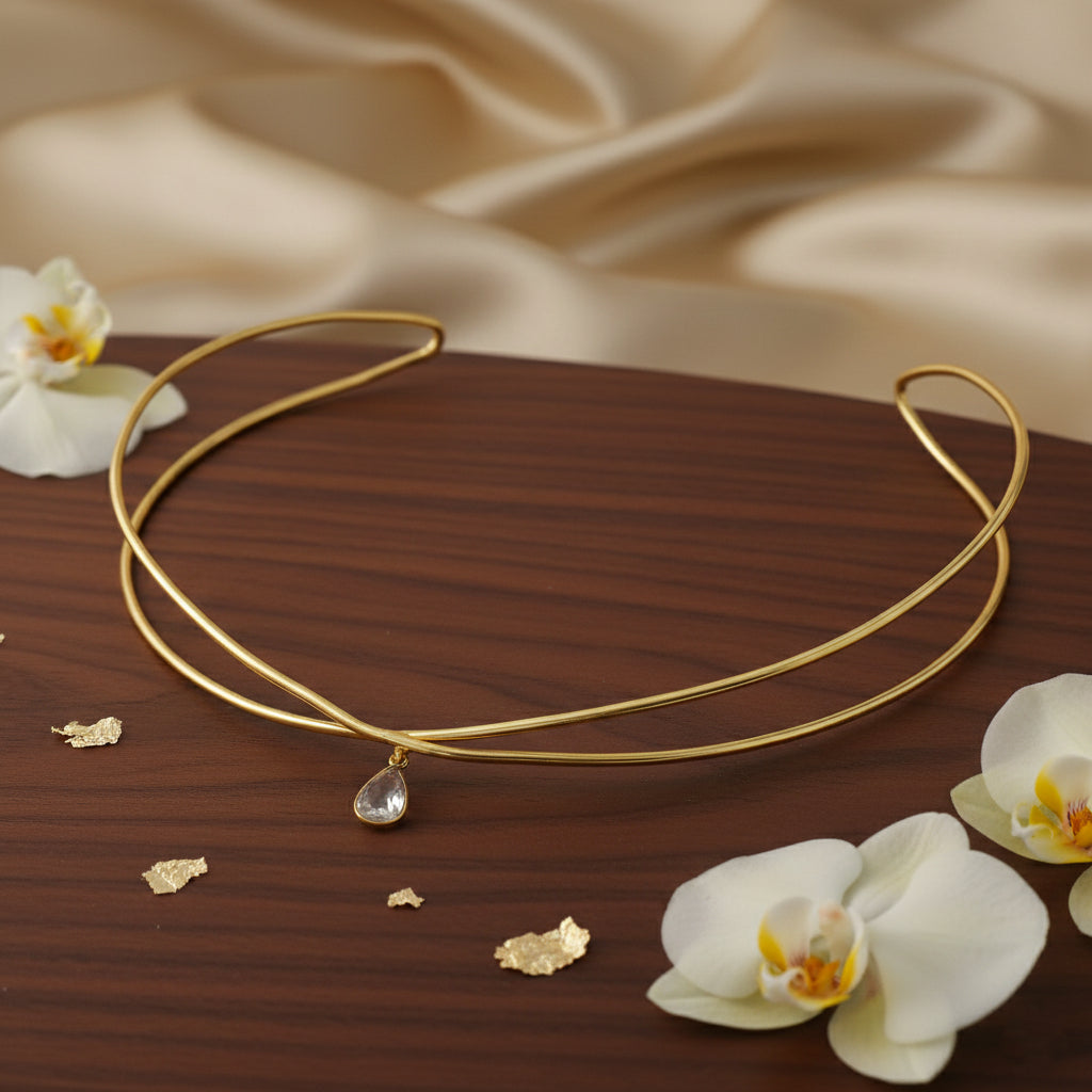 Crafted in gold-plated brass, this celestial crown features a fluid, minimalist form accented with a delicate drop charm at the center. Designed to sit smoothly against the hair, it brings subtle movement and elegance to everyday and occasion styling.