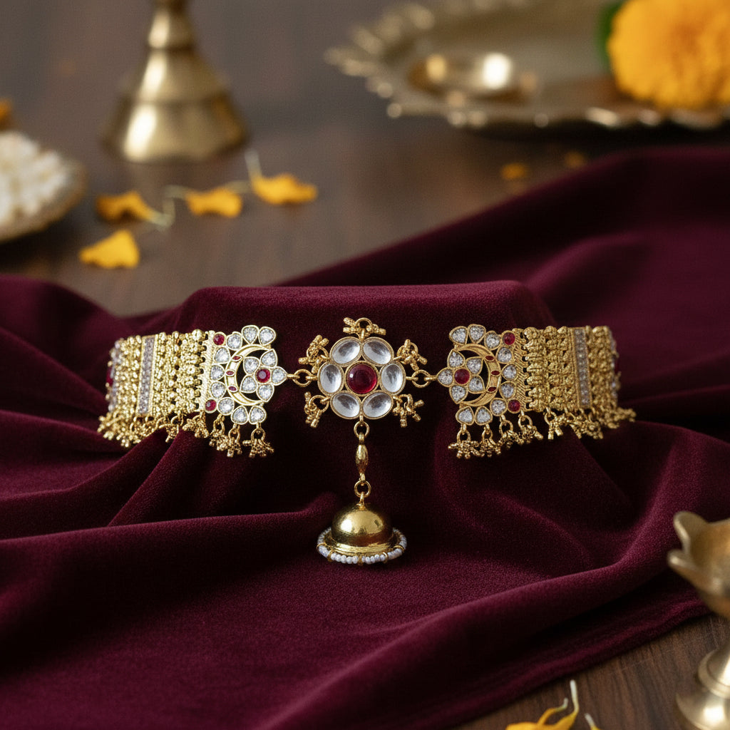 A regal brass matha patti inspired by traditional Kundan aesthetics. Featuring intricate hand detailing with a central drop motif, this piece frames the face beautifully and elevates festive and bridal looks with quiet grandeur. Lightweight yet statement-worthy, it’s made for moments that deserve old-world charm.