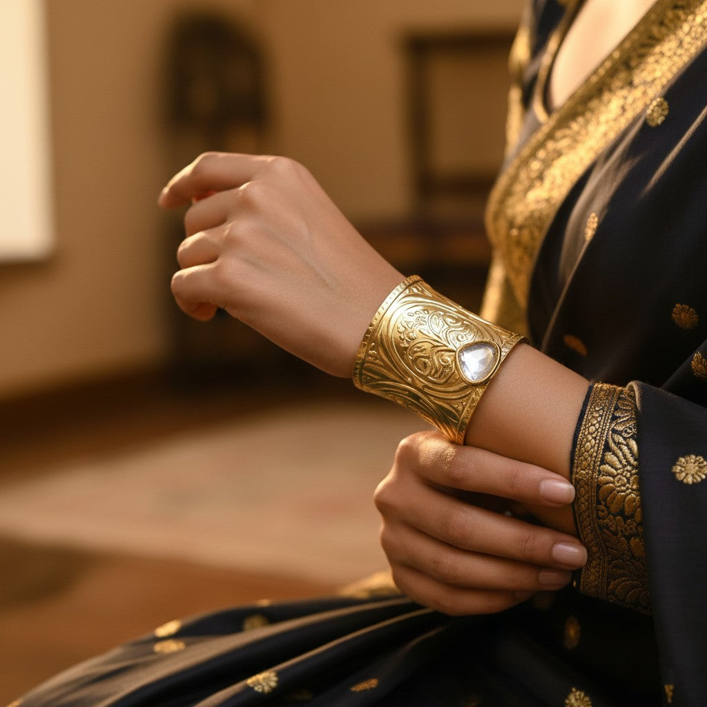 A richly engraved brass Cuff featuring traditional motifs and a central crystal accent. Designed to sit comfortably on the wrist, this piece pairs beautifully with sarees, anarkalis, and festive silhouettes. A timeless classic for traditional wardrobes.
